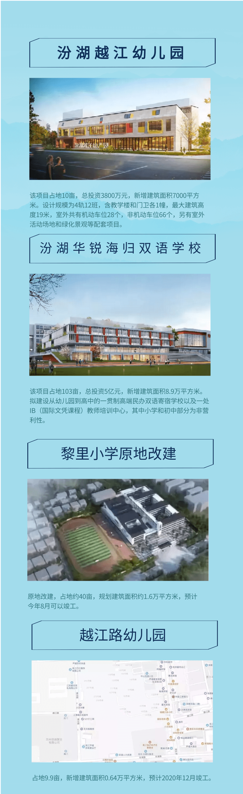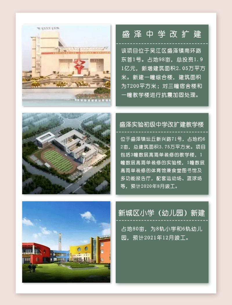 在七都镇、桃源镇、震泽镇等地区,更有庙港幼儿园迁建、桃源幼儿园异地迁建、震泽中学老校区改扩建等项目,目前正在紧锣密鼓的建设当中。