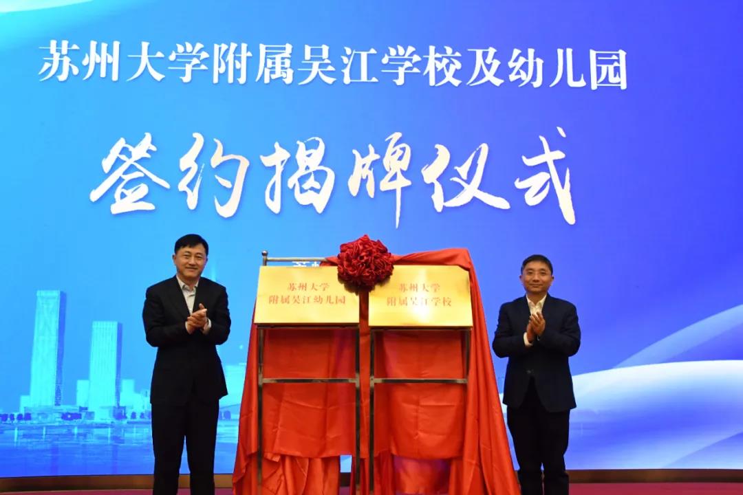 4月19日上午,苏州大学附属吴江学校、苏州大学附属吴江幼儿园签约揭牌仪式在吴江举行,这是继苏州大学未来校区落户吴江后,苏大与吴江的又一教育合作共建项目落地。