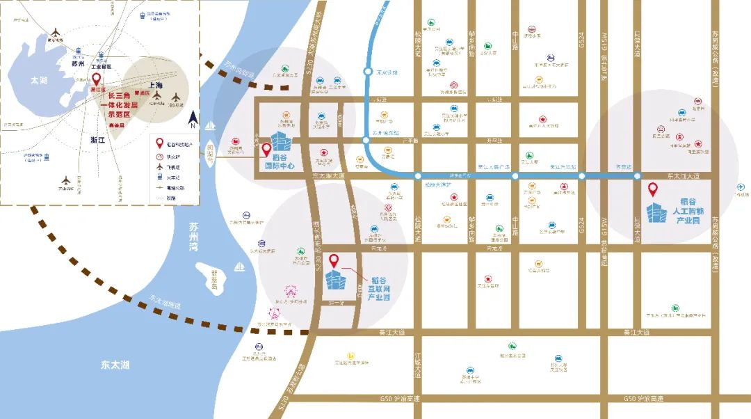 稻谷互联网产业园紧靠苏州湾大道(S230省道),西临太湖、南接浙江、东近上海、北达苏州主城区,处于吴江产业集聚发展带。凭借优越的地理位置和便捷的交通,产业园诠释了新时代生态办公理念。