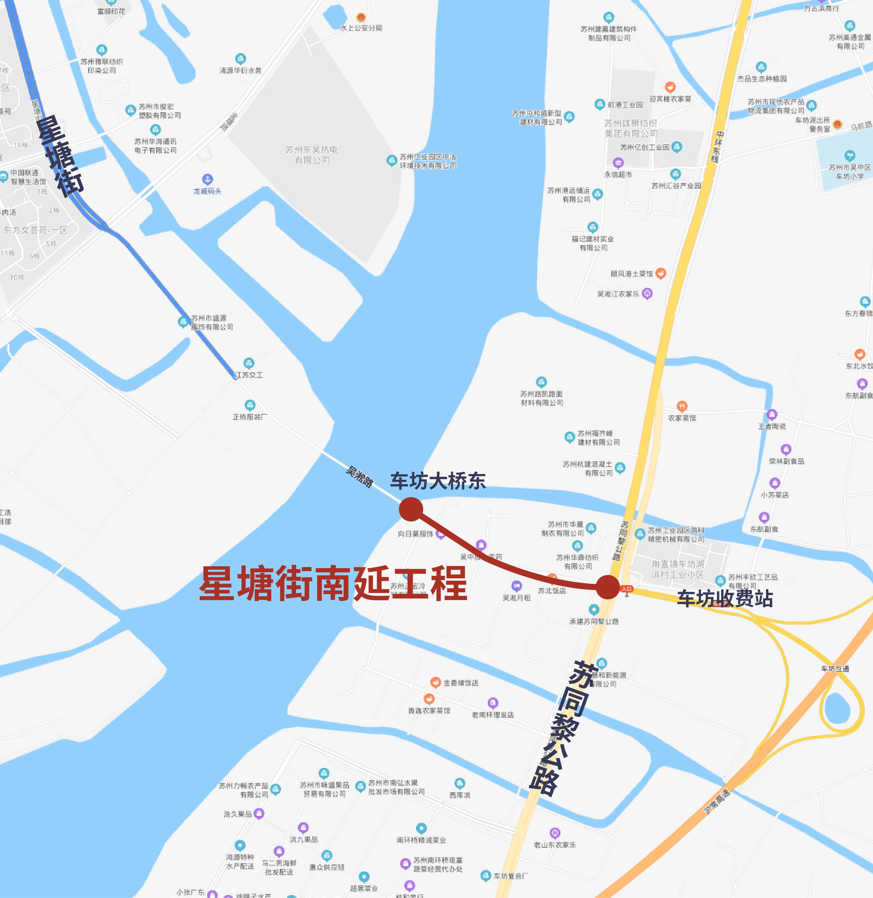 车坊大桥是苏州星塘街南延工程的一部分,此次与苏同黎公路的交接,为吴江至吴中增添了一条高速道路,加快了吴江与苏州主城的融合。