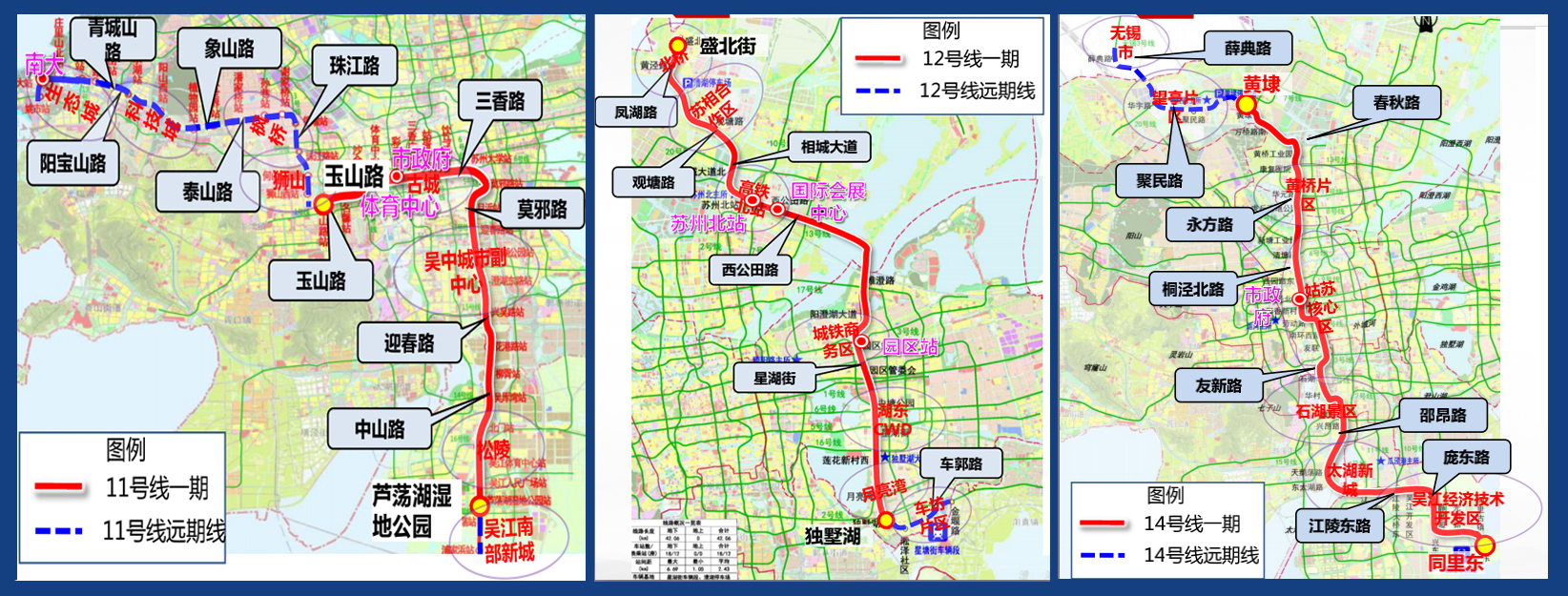2020年起,苏州地铁拟申报三条地铁线:11号线(吴江南部新城到新区科技城)、12号线(吴江苏州湾到相城)、14号线(吴江经发区到相城、吴中)。